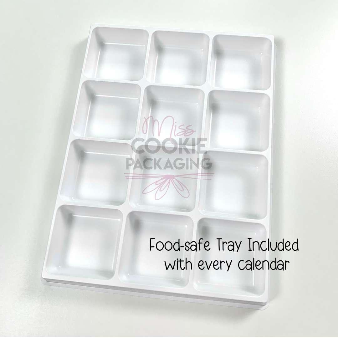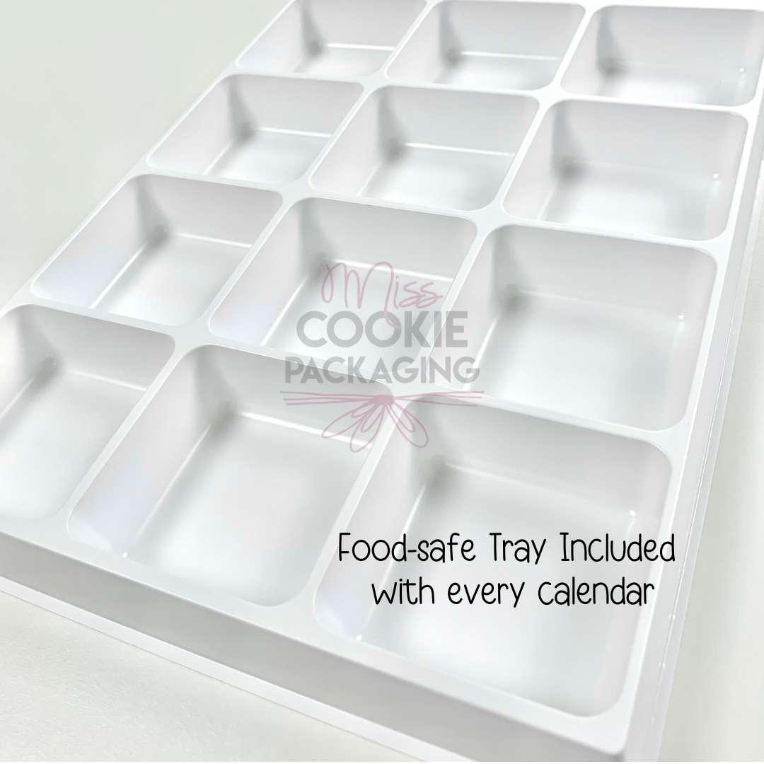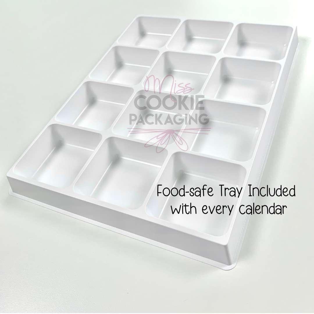 This calendar has been designed specifically to fit most mini sized cookies that are 2″ to 2.25″ on their longest edge.