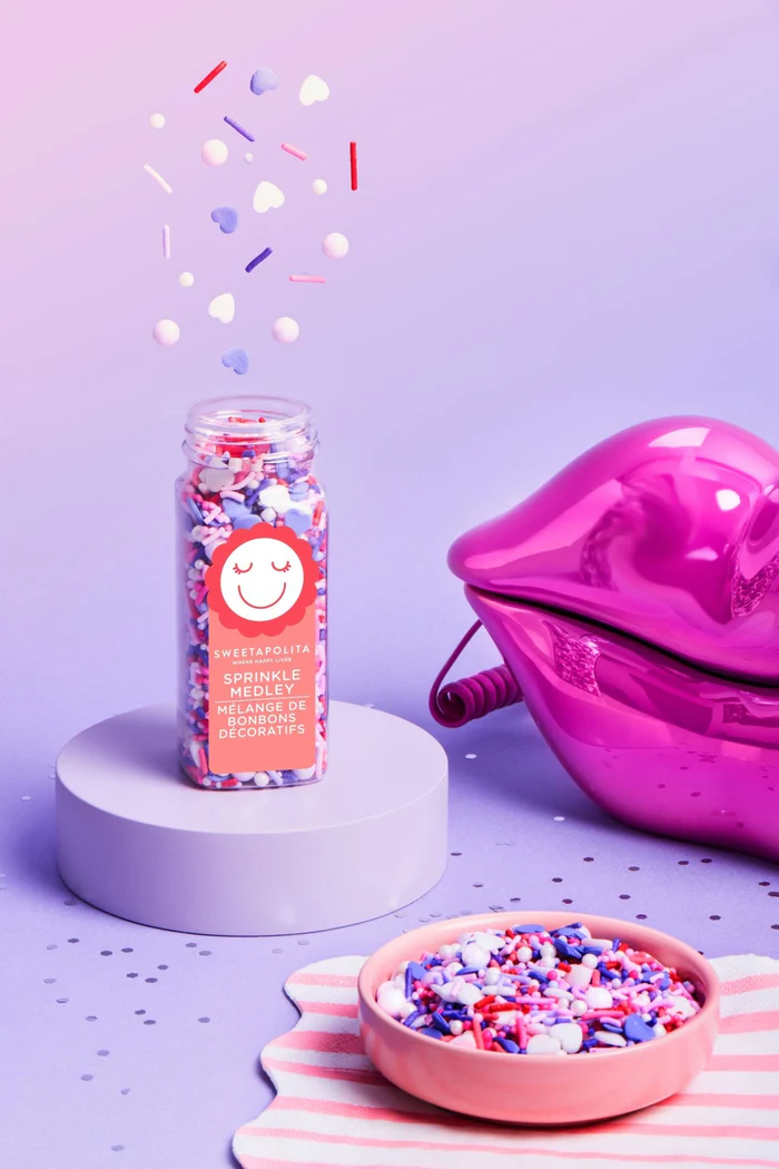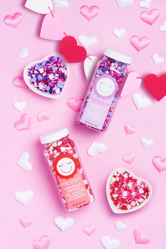 Spread the Love Sprinkle Medley: Jam-packed with yummy colours in shades of pink, purple, and white, this Valentine’s Day mix is as sweet as it is stunning. Featuring premium jimmies, confetti, nonpareils, sugar, candy beads and more, it’s a celebration of love in every bite!